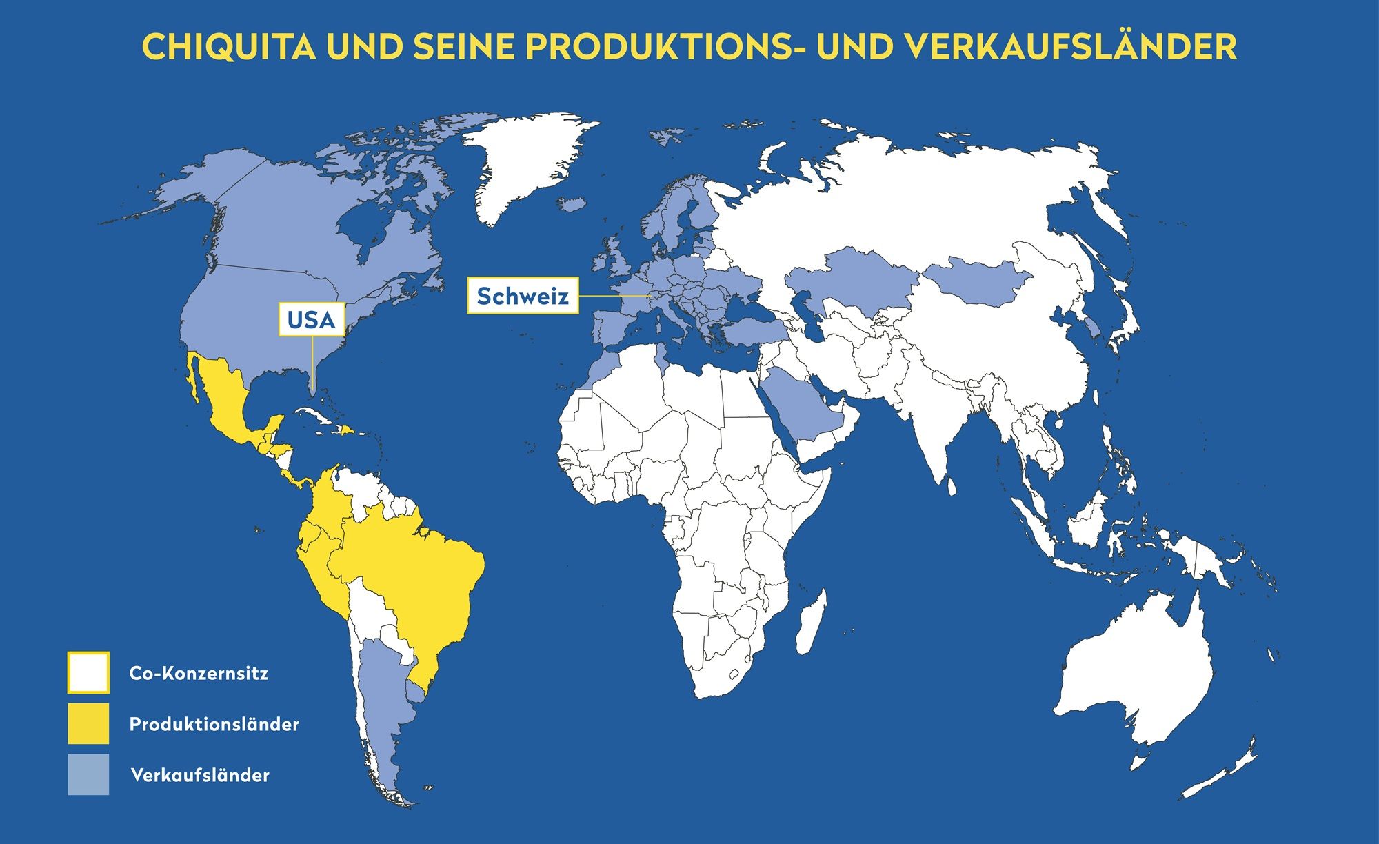 Um die Banane mit dem blauen Aufkleber in knapp 50 Länder zu bringen, setzt Chiquita auf seine vollständig integrierte Wertschöpfungskette. Mit engen Verteilnetzen in Europa und Nordamerika füllt der Konzern die Supermärkte. Seine Flotte von Containerschiffen, beladen an eigenen Häfen, beliefert die dafür nötigen Lager. Kern des Geschäfts sind aber die knapp 70 Plantagen, die Chiquita unseren Recherchen zufolge selbst betreibt. Sie liegen in Mittelamerika, genauer in Costa Rica, Panama, Honduras und Guatemala, sowie in Ecuador.