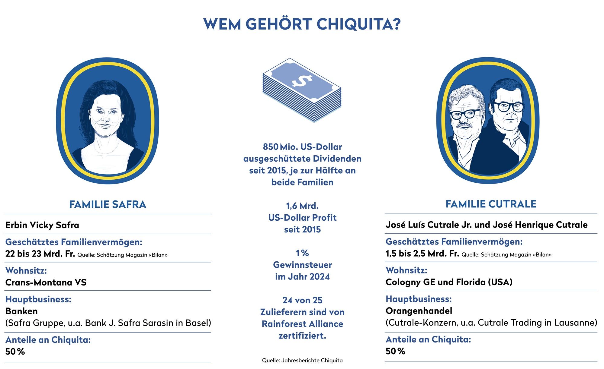Dieser enge Griff um die Wertschöpfungskette und die Anbauregionen lohnt sich für den Konzern und seine Aktionär*innen: Seit 2015 hat Chiquita über 1,6 Milliarden US-Dollar Profit gemacht. Damals wurde der Weltmarktführer im Bananenhandel von den brasilianischen Milliardärsfamilien Safra und Cutrale zu je 50% aufgekauft und von der Börse genommen. Während Chiquita den Besitzerfamilien seither Dividenden in Höhe von 850 Millionen US-Dollar ausgeschüttet hat, erfährt die Öffentlichkeit seit der Privatisierung kaum mehr etwas zu den Geschäftsaktivitäten. Mitglieder beider Familien, die eine primär im Bankgeschäft, die andere im Orangenhandel erfolgreich, leben heute in der Schweiz und gehören zu den 300 reichsten des Landes.