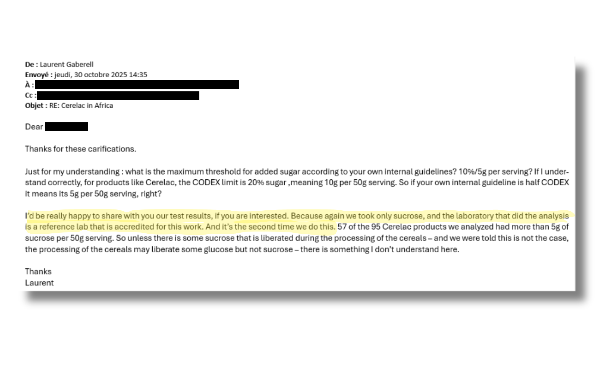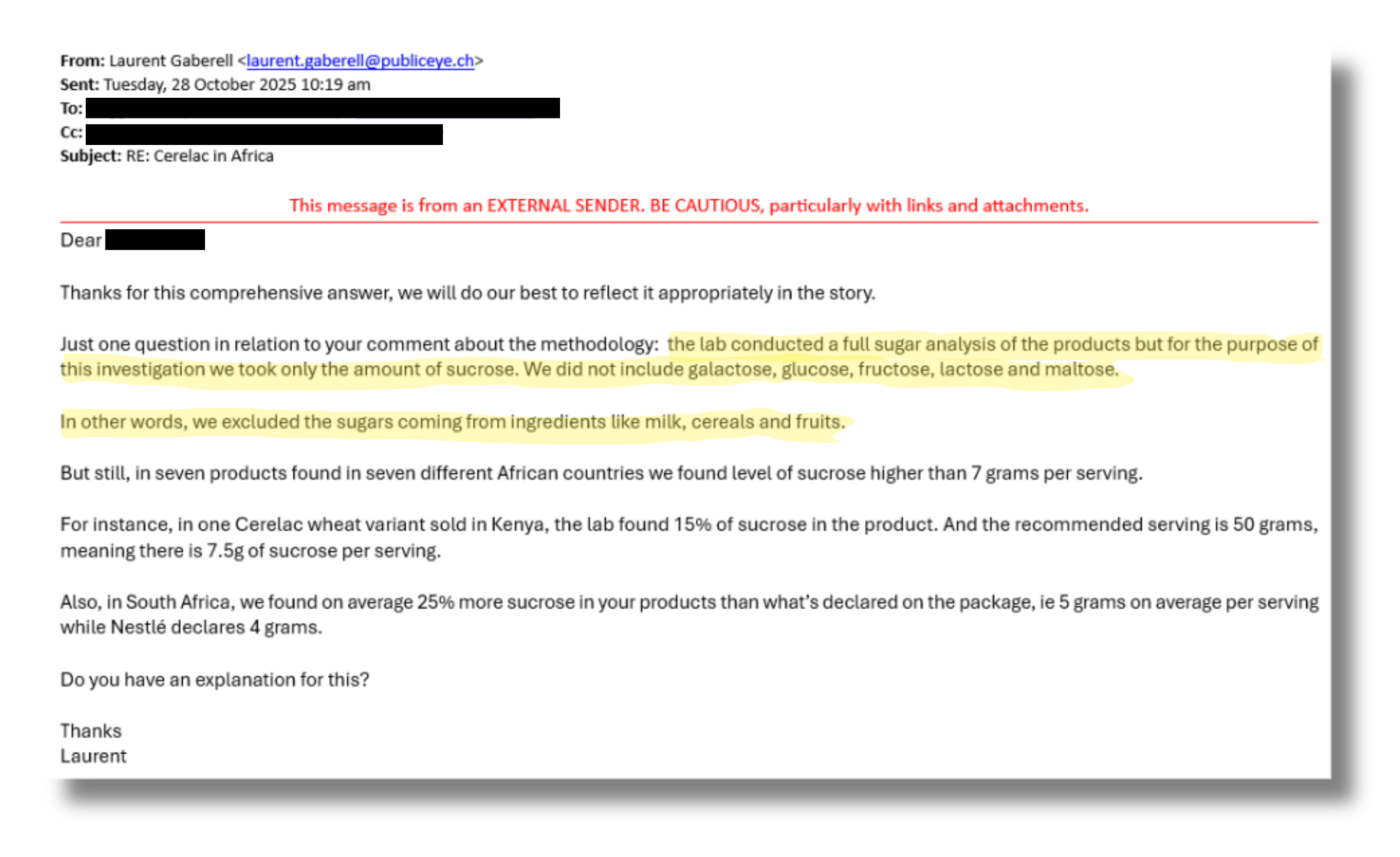 Unsere Untersuchungen berücksichtigten jedoch ausschliesslich Zuckerzusätze in Form von Saccharose und Honig, also explizit keinen natürlich in Getreide, Obst und Milch enthaltenen Zucker. Diese Information ist Nestlé bekannt, haben wir sie dem Unternehmen doch drei Wochen vor der Veröffentlichung unserer Untersuchung schriftlich mitgeteilt. Dies geht aus dieser E-Mail vom 28. Oktober 2025 hervor.