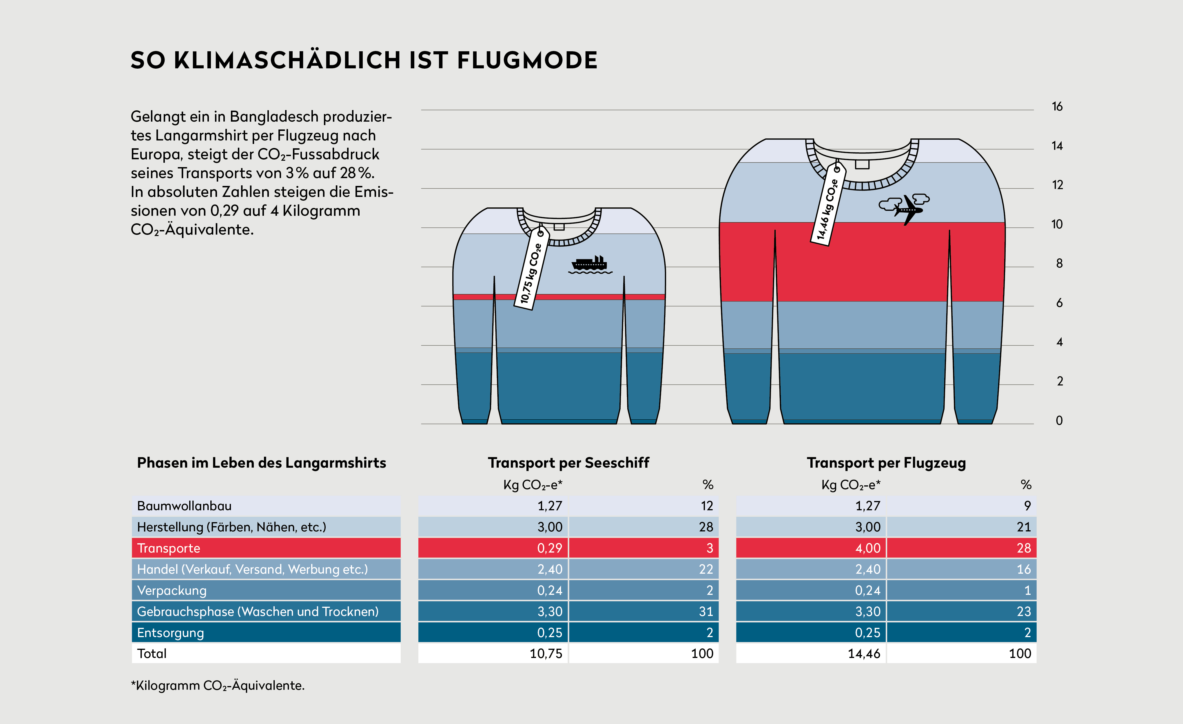 Die Hamburger Umweltberatungsfirma Systain hat mit der deutschen Otto Group den CO2-Fussabdruck eines Langarmshirts berechnet. Das Ergebnis der Studie: Die transportbezogenen Treibhausgasemissionen eines mit Luftfracht transportierten Kleidungsstücks sind rund 14-mal höher als bei einem Teil, das überwiegend per Seefracht transportiert wurde. Das Langarmshirt hat einen langen Weg zurückgelegt: von der Baumwolle aus den USA über Garnherstellung, Färben und Nähen in Bangladesch bis zum Transport des fertigen Produkts mit dem Seeschiff nach Deutschland und im Lastwagen weiter an den Bestimmungsort.