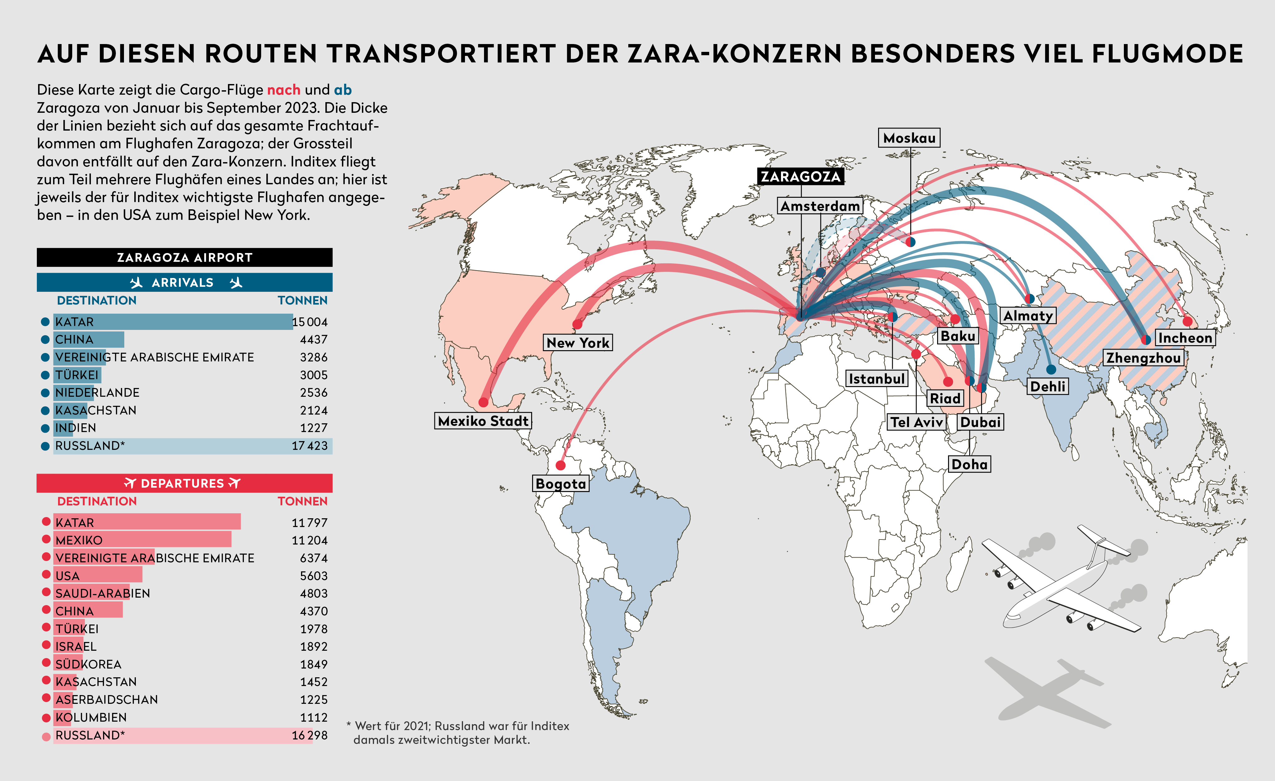 Dadurch wurde Zaragoza 2019 zur Nummer 2 unter Spaniens Frachtflughäfen; vom Gesamtvolumen von 183'000 Tonnen entfielen gemäss der regionalen Wirtschaftsförderung 90% auf Inditex. 2022 sank das Volumen nach rekordhohen 194'000 Tonnen im Jahr 2021 als Folge des Kriegs in der Ukraine um gut 34%, wohl auch weil Inditex in Russland, seinem nach Spanien wichtigsten Markt, seine 502 Läden und den Onlineshop geschlossen hatte. Zuvor hatte Inditex Moskau mit zwei Cargo-Jumbos der russischen AirBridgeCargo pro Woche angeflogen.