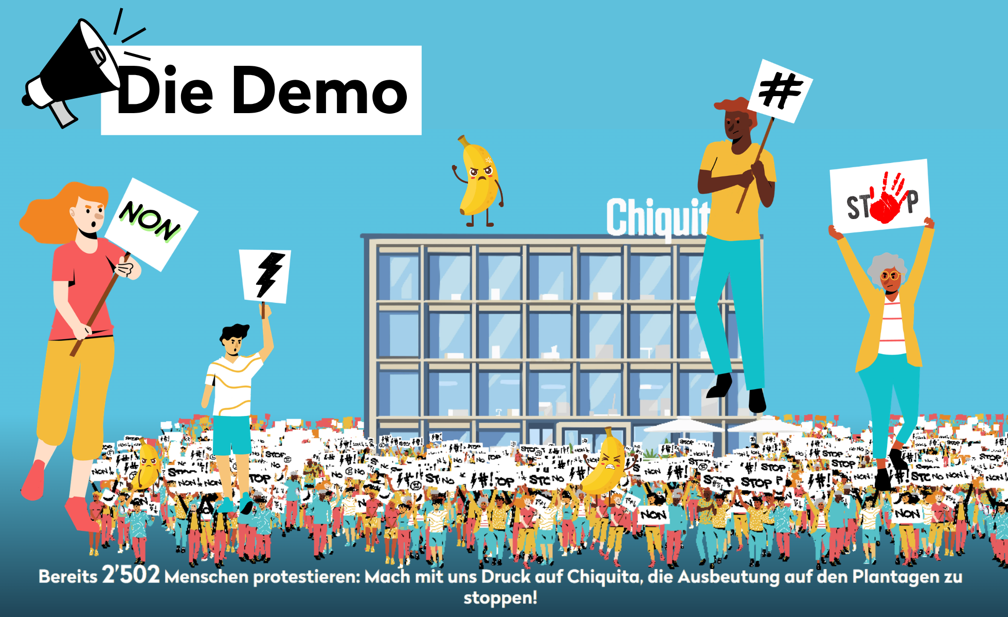 Um maximalen Druck auf Chiquita auszuüben, organisieren wir ab Dienstag, dem 21. April, eine Demonstration vor dem – virtuellen – Hauptsitz des multinationalen Konzerns unter folgender URL: stopp-chiquita.ch.