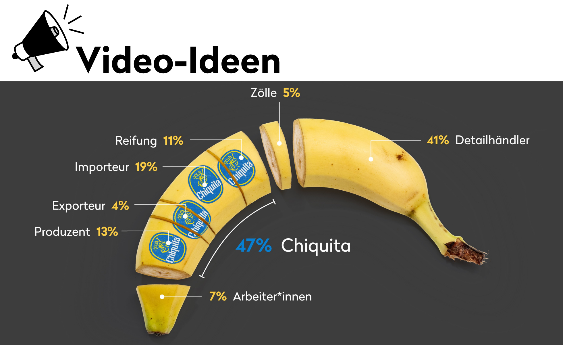 - In der Bananenproduktion ist die Verteilung der Gewinne extrem ungleich. Nur 7% des Gewinns aus einer Banane gehen an die Arbeiter*innen, während 47% in die Taschen von Chiquita fließen.