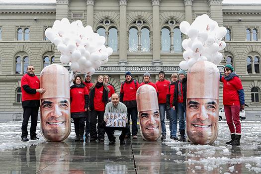 Recherchen der EvB enthüllen, dass die Uniformen der Polizei und die Tarnanzüge der Armee unter äusserst problematischen Bedingungen hergestellt werden: Die Näherinnen in Mazedonien verdienen lediglich 122 Franken pro Monat! Mit einem humorvollen Video ruft die EvB die Schweiz dazu auf, bei der Revision des Gesetzes zur öffentlichen Beschaffung auch klare soziale Kriterien aufzunehmen. Der Beginn langwieriger Lobbyarbeit, die bis heute fortdauert…