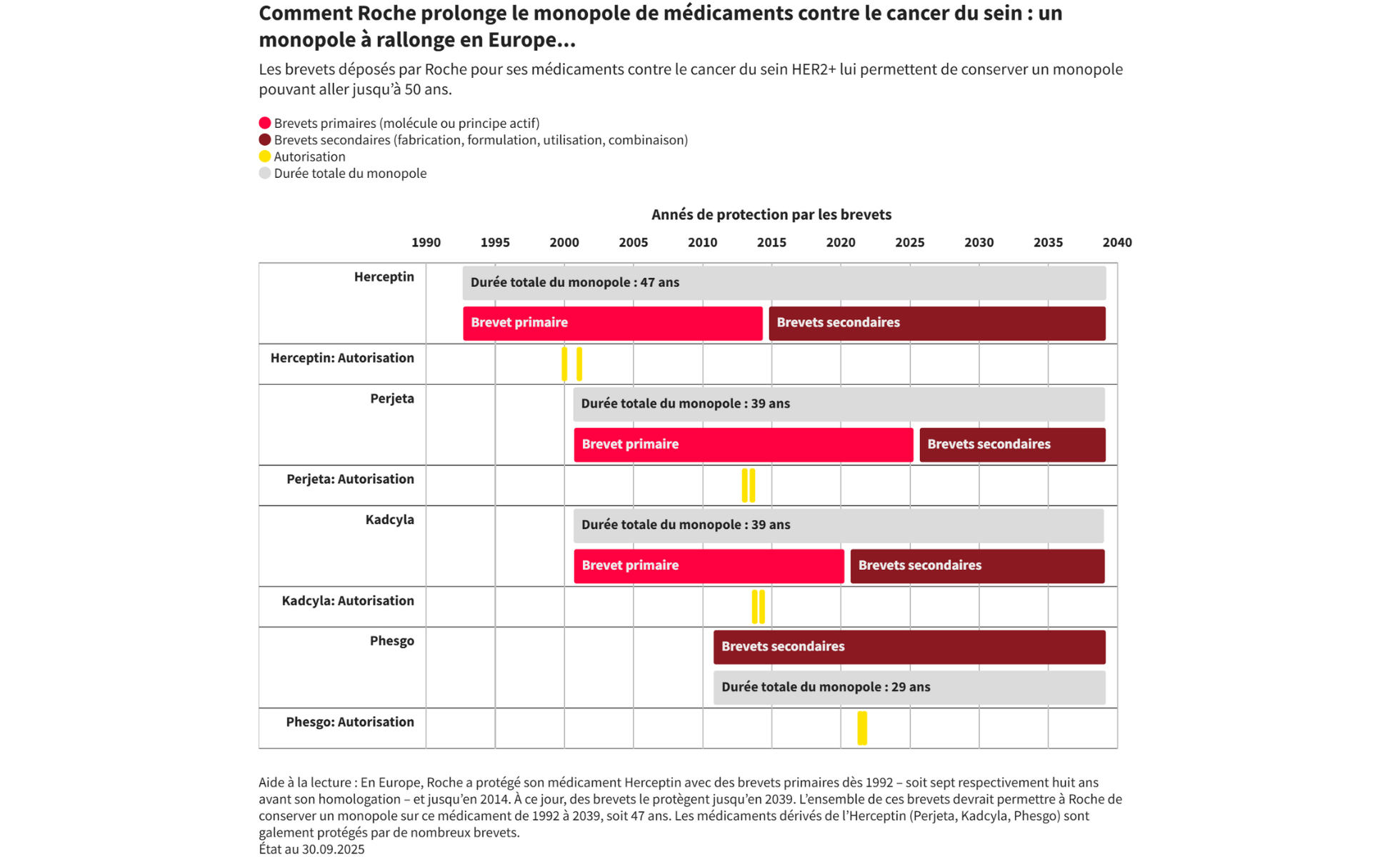 Depuis la fin des années 1990, Roche a généré plus de 156 milliards de francs de ventes grâce à l’Herceptin et ses dérivés – le Perjeta, le Kadcyla et le Phesgo – des traitements contre une forme particulièrement agressive de cancer du sein (HER2+). Essentiels pour de nombreuses patientes, ces médicaments biologiques constituent l’un des piliers du chiffre d’affaires du groupe. Derrière cette réussite se cache une stratégie bien rodée d’evergreening – une accumulation abusive de brevets secondaires. Plutôt que de permettre de véritables avancées thérapeutiques, ceux-ci servent surtout à maintenir un prix élevé grâce au monopole, au détriment des patient·e·s et des budgets de santé publique.