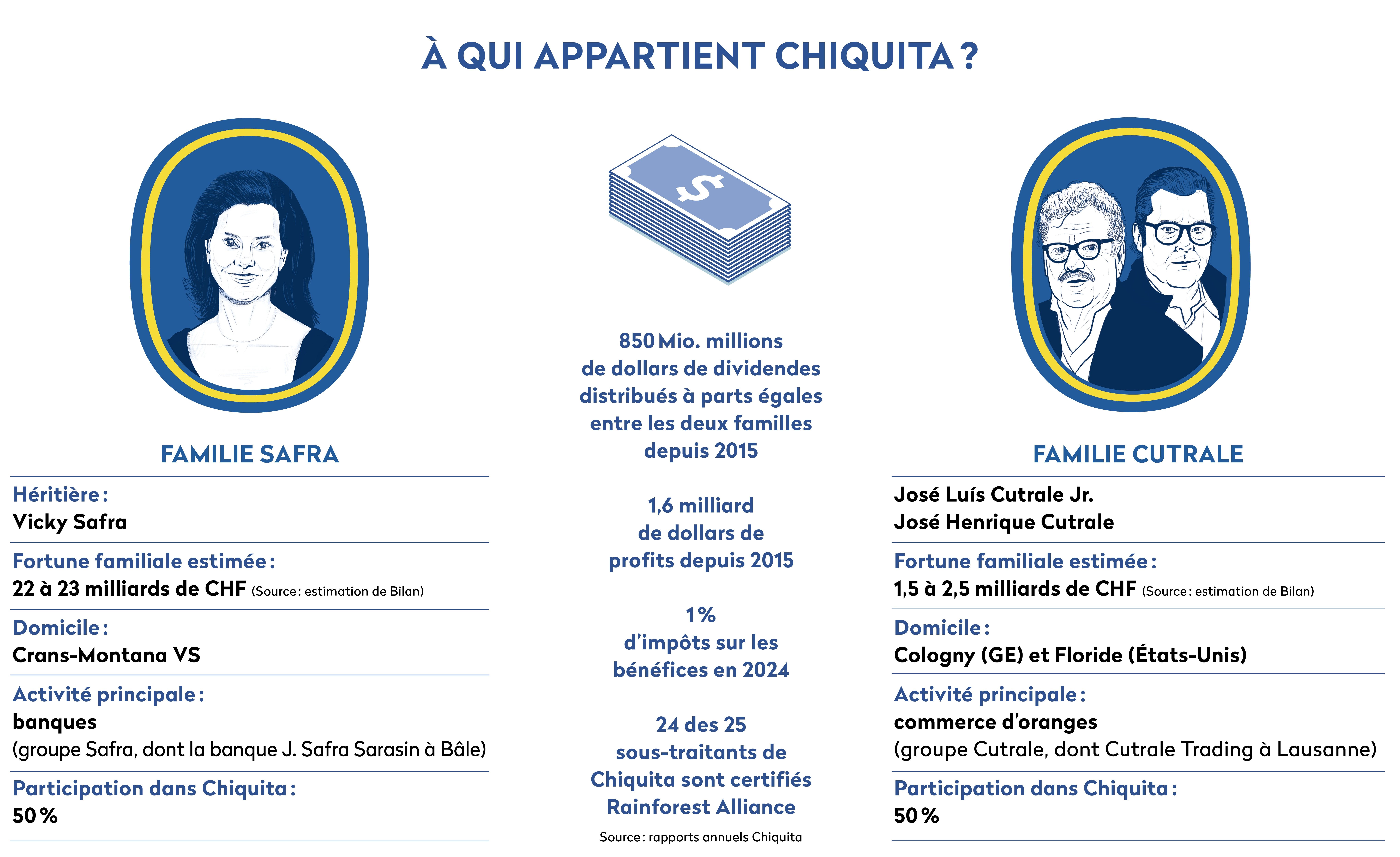 Ce contrôle serré de la chaîne de valeur et des régions de production s’avère payant pour le groupe et ses actionnaires: depuis 2015, Chiquita a réalisé plus de 1,6 milliard de dollars de bénéfices. À l’époque, le numéro un de la banane avait été racheté à parts égales par les familles milliardaires brésiliennes Safra et Cutrale et retiré de la Bourse. Depuis sa privatisation, Chiquita a reversé au total quelque 850 millions de dollars de dividendes à ses propriétaires. Le grand public, lui, n’a pratiquement plus aucune information sur ses activités commerciales. Des membres des deux familles – l’une prospérant principalement dans la banque, l’autre dans le commerce des oranges – résident en Suisse et figurent parmi les 300 plus grandes fortunes du pays.